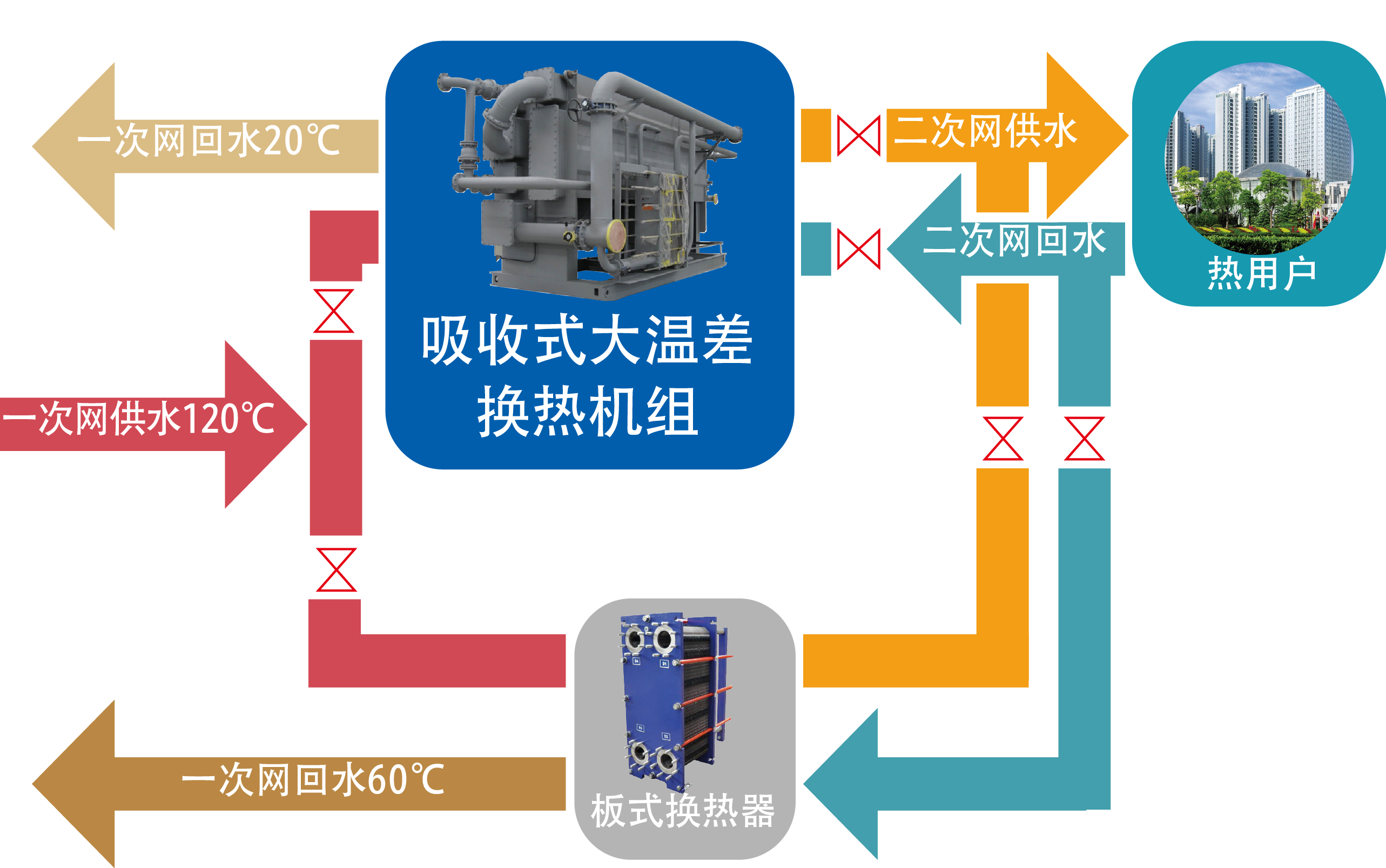 完整的吸收循環(huán)由基于吸收循環(huán)的超大溫差供熱技術(shù)和基于吸收式循環(huán)的余熱回收技術(shù)組成:在首站增設(shè)余熱回收專用機(jī)組回收凝氣余熱,解決熱源不足問題;同時(shí)在城市換熱站設(shè)置吸收式大溫差機(jī)組替代原有的板式換熱器,用于降低一次網(wǎng)回水溫度,拉大一次網(wǎng)供回水溫差,解決熱網(wǎng)輸送能力不夠問題。